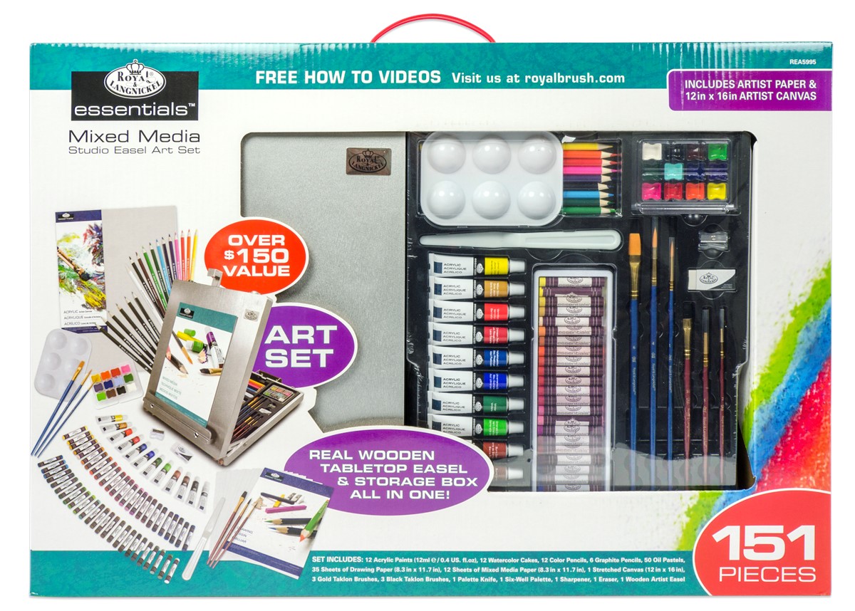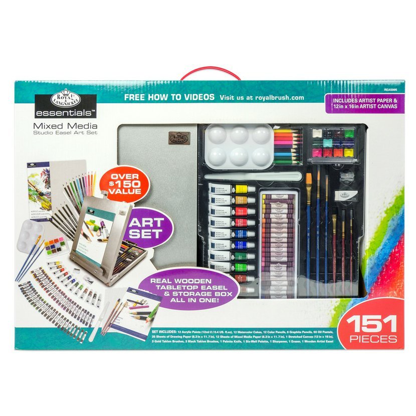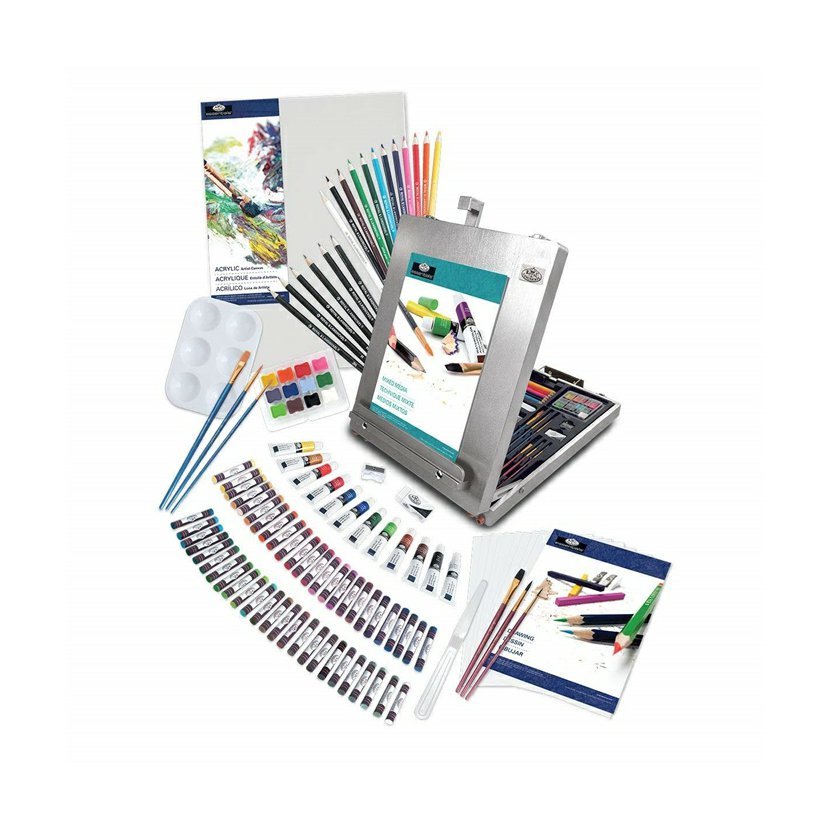 Royal & Langnickel ponúka výnimočný umelecký set so stojanom, ktorý je ideálny pre začínajúcich aj pokročilých umelcov. Sada je ideálna pre každého, kto chce objaviť rôzne techniky maľby a kresby. Celý set je usporiadaný v elegantnom drevenom úložnom boxe, ktorý slúži zároveň ako stolový stojan na maliarske plátno. Set obsahuje širokú škálu produktov z rady Royal & Langnickel Essentials, ktoré sú perfektné pre tých, ktorí sa chcú naučiť nové techniky alebo vyskúšať rôzne umelecké médiá. V balení nájdete všetko potrebné na vytvorenie akrylových, olejových a akvarelových malieb, skíc a pastelových diel. Tento ateliérový set obsahuje 50 olejových pastelov, 12 farebných ceruziek, 6 grafitových ceruziek, 12 akrylových farieb po 12 ml, 3 štetce Golden Taklon, 3 štetce Black Taklon, 12 akvarelových panvičiek, 12 hárkov mix média papiera a 35 hárkov kresliaceho papiera. Ďalej obsahuje špachtľu, plátno, strúhadlo, gumu a drevený stolový stojan na maliarske plátno s koženou rúčkou a striebornými úchytmi. Set je skvelým začiatkom pre mladých a nadchádzajúcich umelcov, ktorí chcú vyskúšať rôzne umelecké médiá. Umožňuje vytvárať rozmanité diela a rozvíjať umelecké schopnosti. Tento bohatý set je ideálny pre každého, kto chce skúsiť rôzne umelecké techniky a nájsť si tú, ktorá mu najviac vyhovuje. 50 50 olejových pastelov 12 farebných ceruziek 6 grafitových ceruziek 12 akrylových farieb v tube 12 ml 3 štetce Golden Taklon 3 štetce Black Taklon 12 akvarelových panvičiek 12 hárkov mix média papiera 35 hárkov skicovacieho papiera špachtľa plátno strúhadlo guma drevený stolový stojan